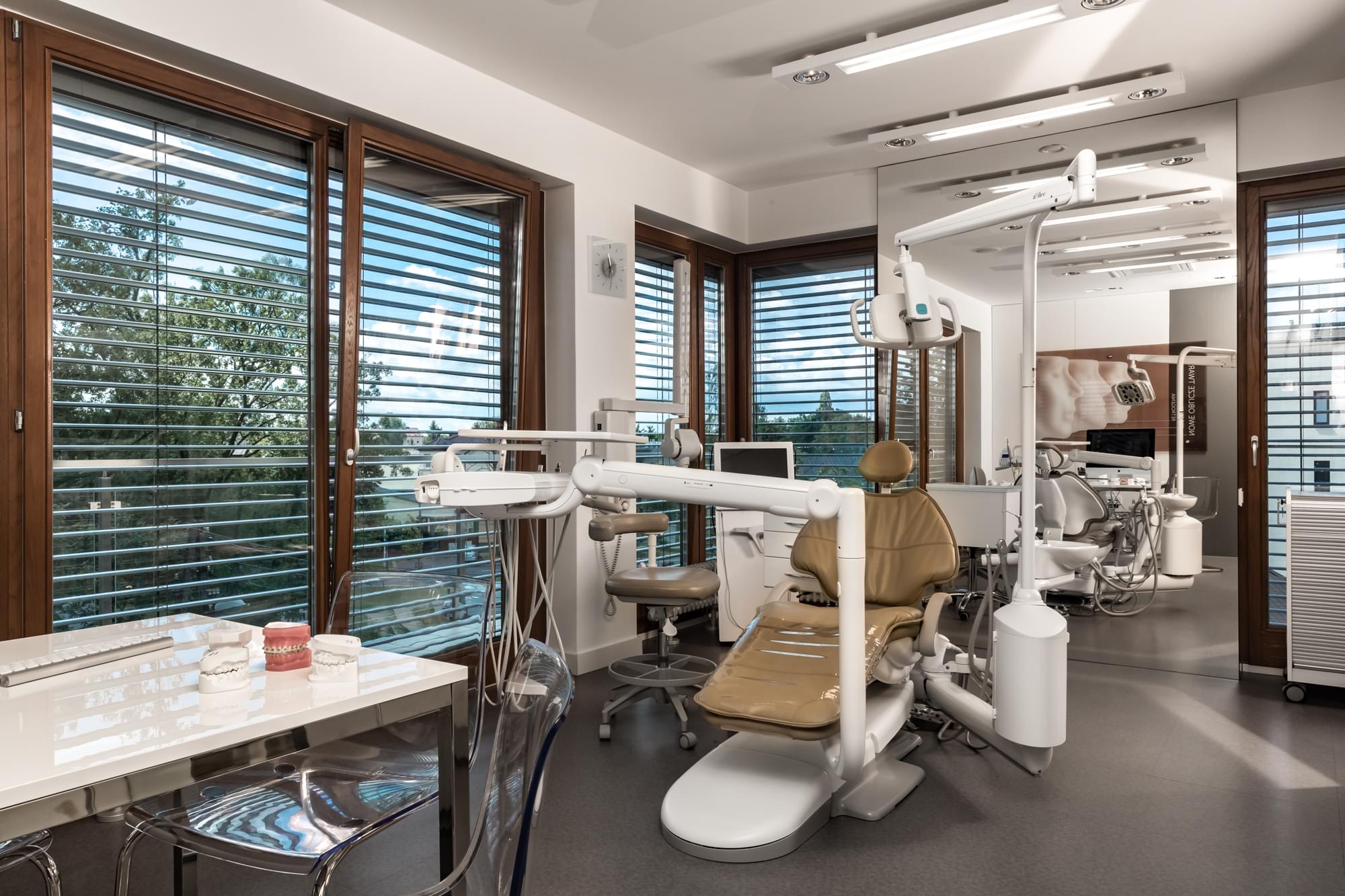 Wielu Pacjentów unika wizyt u stomatologa, bojąc się przede wszystkim stresu i bólu. Rozumiejąc to, stworzyliśmy gabinety, w których najważniejszy jest komfort, bezstresowa atmosfera oraz ergonomia, pozwalająca skupić się Pacjentom na efekcie leczenia, nie samym leczeniu. Każdy z 4 gabinetów wyposażony jest w nowoczesne i wygodne unity stomatologiczne, rentgen oraz radiowizjografię. Leczenie kanałowe przeprowadzamy pod mikroskopem. Jako klinika specjalizująca się w wadach zgryzu, każdy z naszych gabinetów przygotowaliśmy tak, aby możliwe było w nim nowoczesne leczenie ortodontyczne. Proste zabiegi chirurgiczne oraz leczenie implantologiczne, wymagające wszczepienia implantu, wykonujemy z kolei w specjalnie przystosowanych do tego gabinetach chirurgicznych. Każde z pomieszczeń Face-Clinic, w którym przeprowadzamy zabiegi jest przestronne, pełne dziennego, naturalnego światła, nowocześnie zaprojektowane.